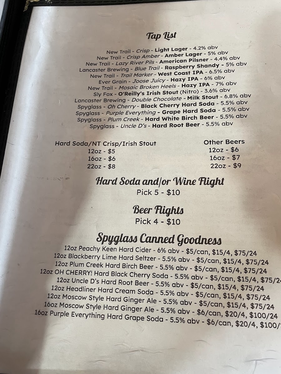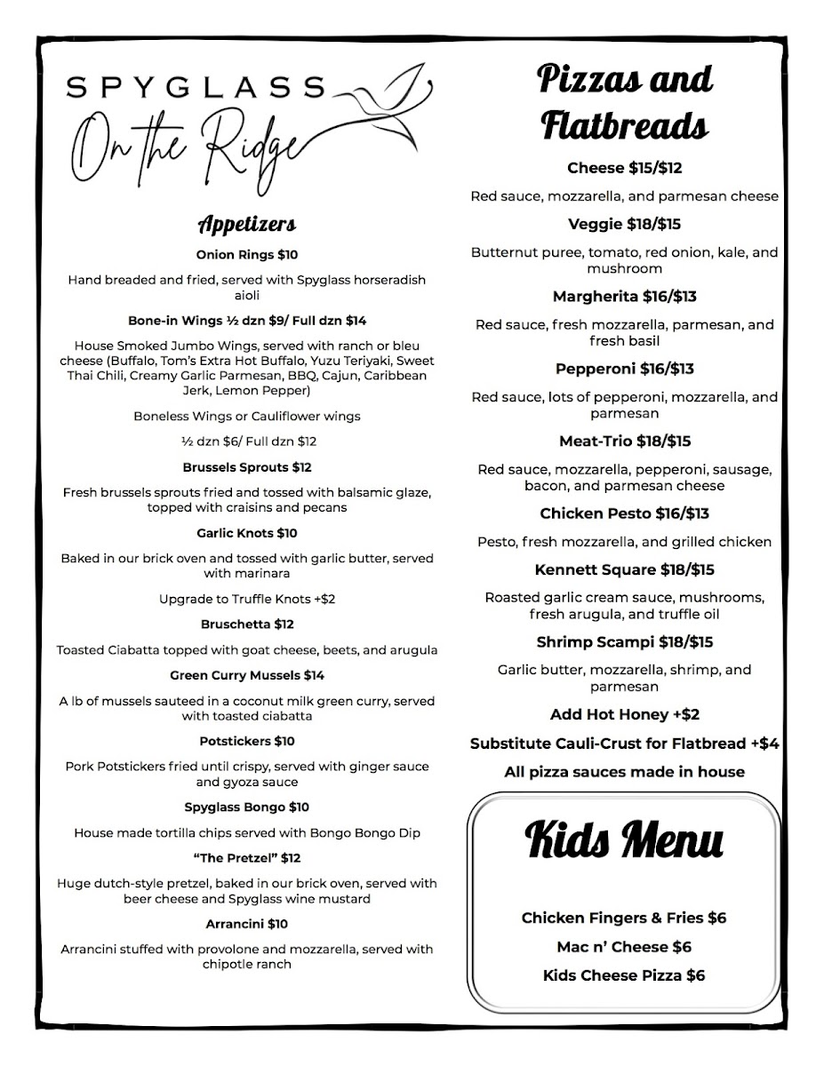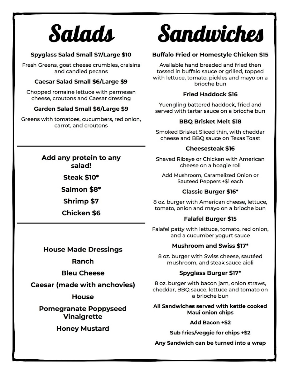 Overall, the menu supports a leisurely pace and a welcoming atmosphere, inviting guests to take their time and enjoy each element as part of an enjoyable day or evening at Spyglass on the Ridge.