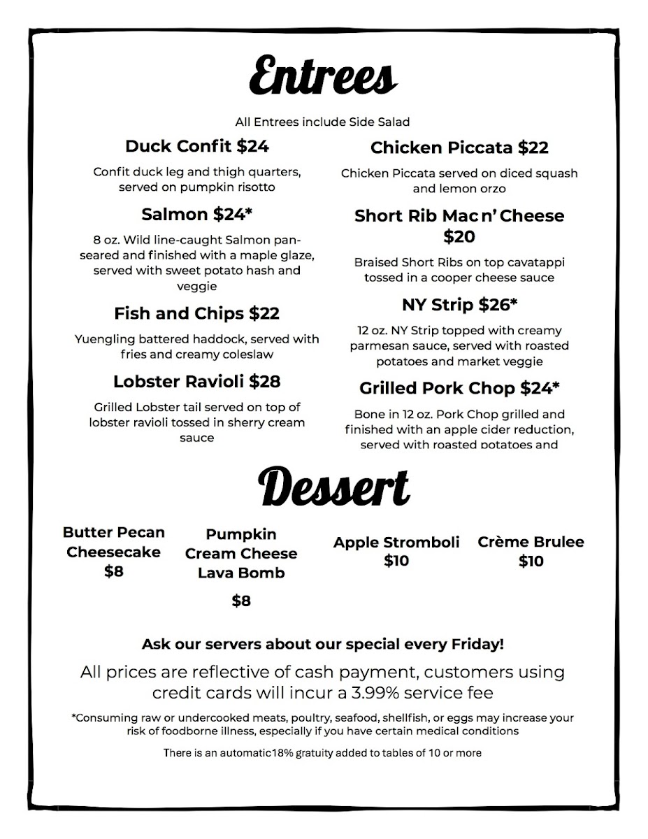 You’ll find comforting favorites like Fish and Chips and Chicken Caesar Salad alongside more refined entrees such as Duck Confit and Lobster Ravioli. The menu also includes casual snacks and shareable options, reflecting the easygoing yet thoughtful nature of the setting. For dessert, choices like Butter Pecan Cheesecake and Crème Brulee offer a satisfying way to finish a meal.