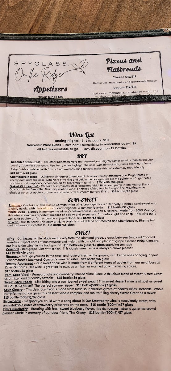 The menu at Spyglass on the Ridge Winery & Restaurant offers a thoughtful balance of approachable dishes and carefully crafted drinks, perfect for enjoying throughout the day or into the evening. Whether you're settling in for a relaxed lunch, pairing a meal with a glass of wine after a day outdoors, or sharing bites during an event, the selection feels inviting and well suited to the winery’s warm atmosphere.